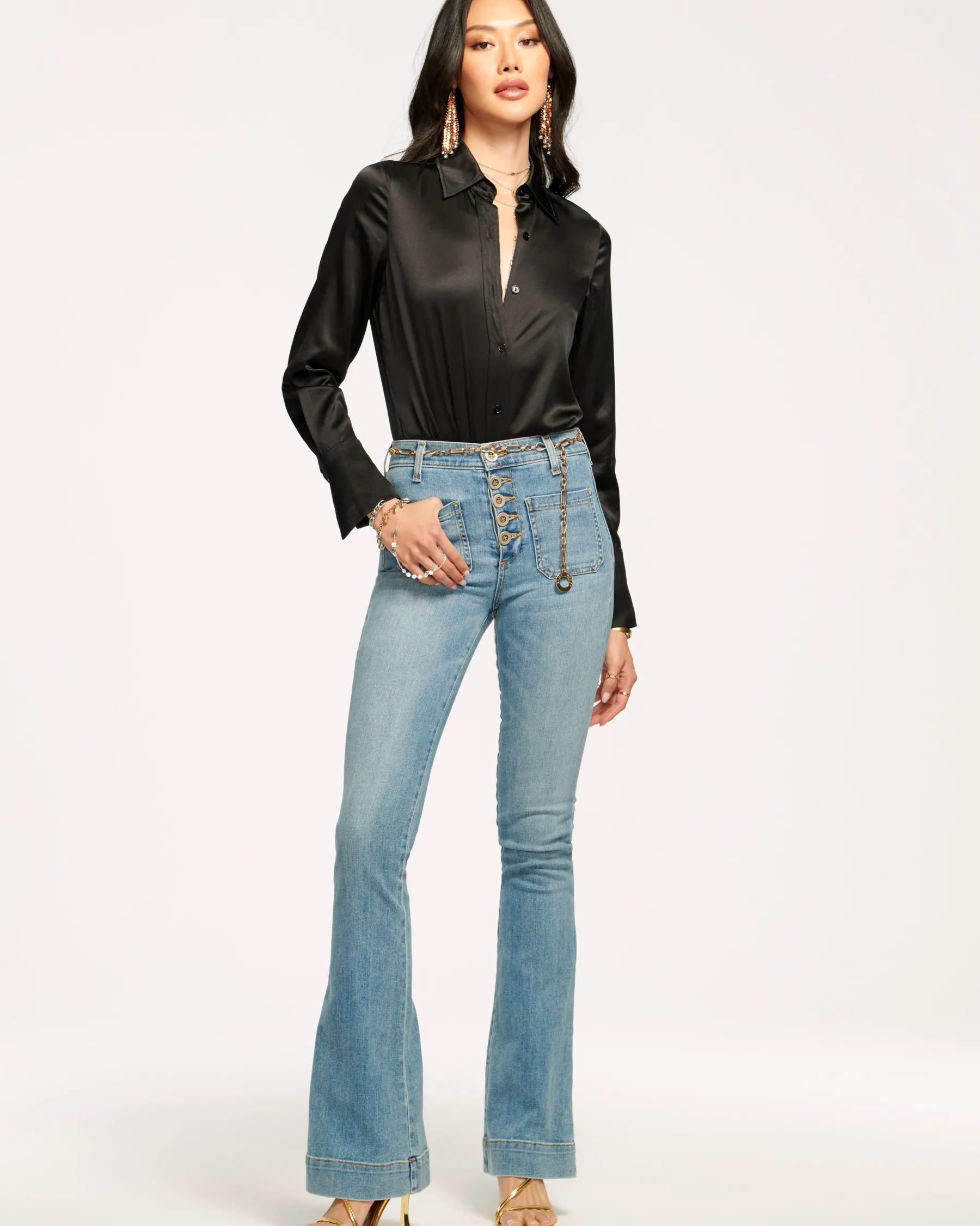 Our Cindy High-Rise Flare serves up serious retro vibes with the same sculpting, flare silhouette as our best selling Helena. The five-button closure and square front pockets will elevate your ensemble whether you’re headed to a casual brunch or a hot date. Crafted from Japanese denim with just the right amount of stretch, these jeans will satisfy your 70s disco fix.